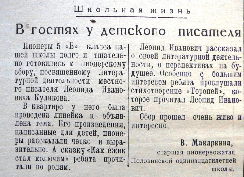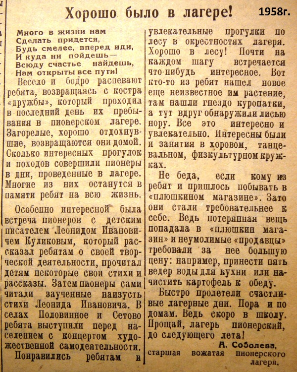 В 1958 году в газете "Вперёд" вышла заметка о посещении Л. И Куликова пионерского лагеря в Воздвиженке.