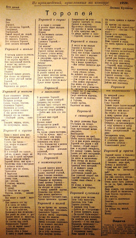 Именно живя в Половинном, прикованный к постели Леонид начал писать стихи для детей. Первые его произведения "На пустыре" и "Про кота" были опубликованы в "Пионерской правде" в 1946 году, когда молодому поэту исполнилось 22 года.