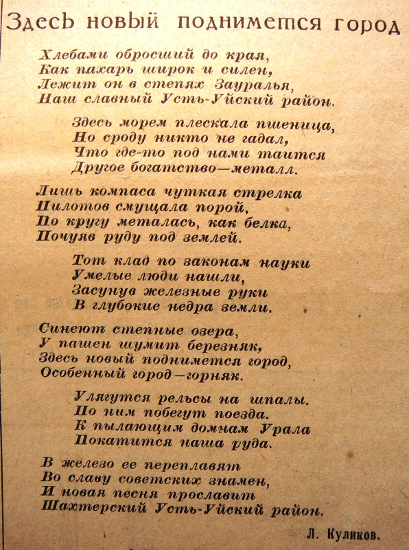 В 50-х годах в газете "Вперёд" вышло в свет стихотворение Леонида Куликова об Усть-Уйском районе: