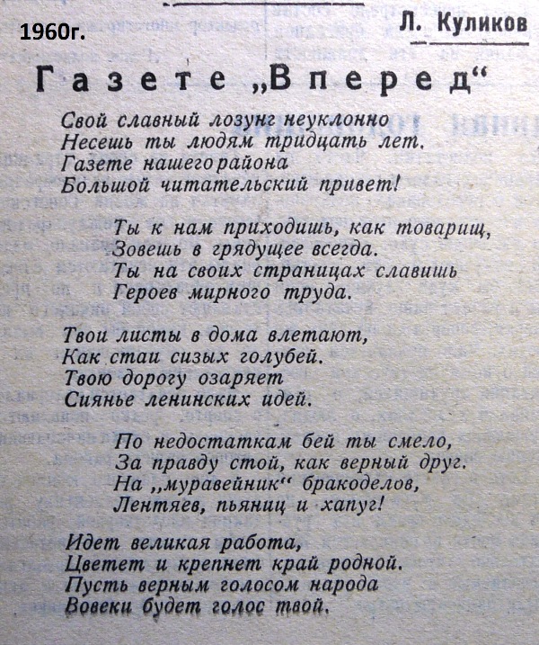 А вот стихотворение Куликова на 30-летие газеты "Вперёд":